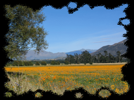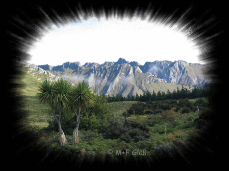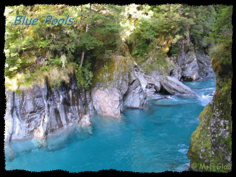 Bunte Blumenfelder bei Gladstone, Cabbage Trees vor schroffen Bergen, Wasserfälle und türkis-blaue Blue Pools waren unsere Wegbegleiter auf dem Weg über Haast zu den Gletschern. |