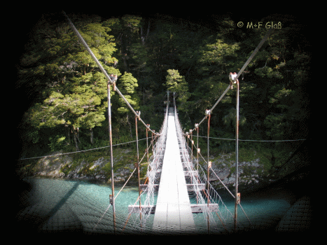 Einige Wanderwege werden von Flüssen gekreuzt und führen dann, wie hier bei den Blue Pools, über solche spaßigen Hängebrücken: |