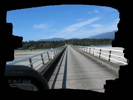 In Neuseeland gibt es unzählige einspurige Brücken. Bei Haast sind wir über die mit 732 Metern längste “One lane Bridge” gefahren. |