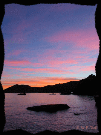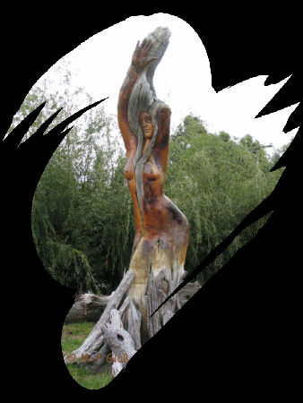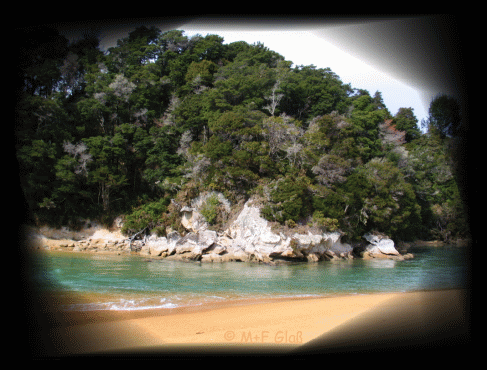 Unser Standplatz für die Nacht war nicht sehr romantisch (Parkplatz am Hafen), dafür war der Sonnenaufgang von dort aus betrachtet unglaublich kitschig schön! Im Abel Tasman National Park haben wir uns den Strand von Kaiteriteri angesehen (Frank ist sogar in der Tasman Sea geschwommen - brrr) und später haben wir einen tollen Künstler-Garten in Marahau gefunden, wo sehr schöne Holzschnitzereien zu bewundern waren. |