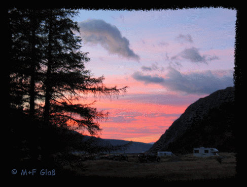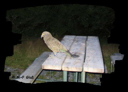 Morgens sind in der Dunkelheit Keas um den Campervan „geschlichen“. Der Versuch sie zu filmen oder zu fotografieren hat sie aber leider wieder vertrieben. Das Blitzlicht hat sie wohl erschreckt. Schade, wir hätten gerne mehr von den fliegenden Kobolden gesehen... |