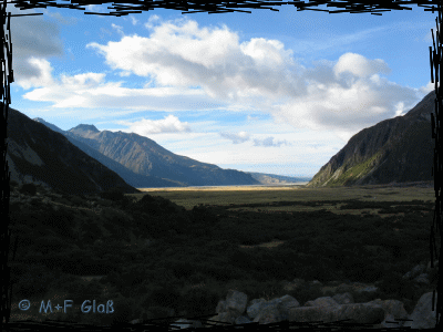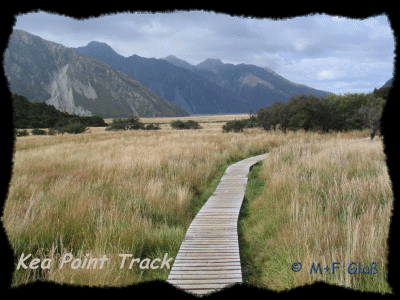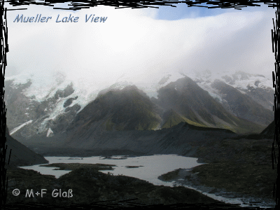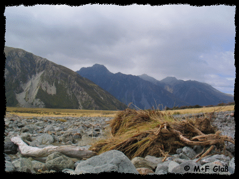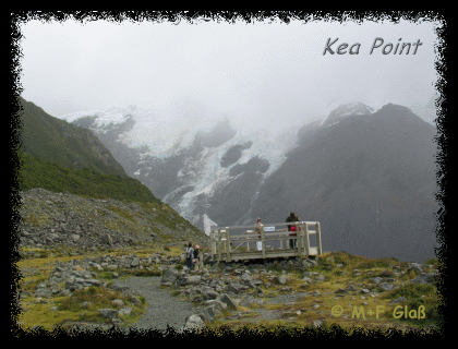 Anschließend ging es vom Hermitage aus zum Kea Point. Dort hat uns der Wind das Gletschereis so heftig um die Ohren geblasen, dass wir schnell wieder die Flucht ergriffen. |