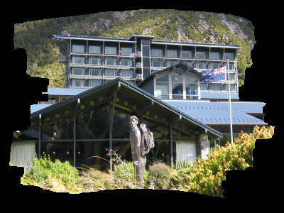 Links sieht man das wahrscheinlich berühmteste Hotel des Landes “The Hermitage” mit einer Statue von Sir Edmund Hillary. |