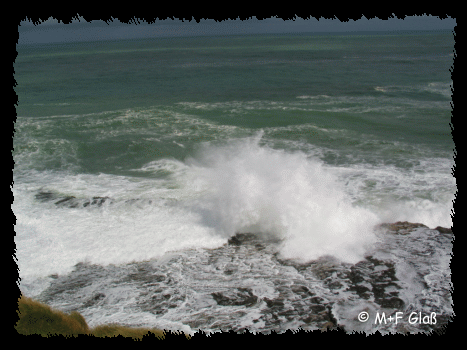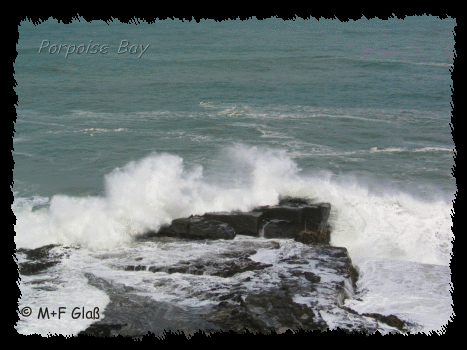 Leider war der Weg zur Cathedral Cave geschlossen, wahrscheinlich, weil es zu stürmisch war. Wir sind statt dessen zur Porpoise Bay gefahren, weil dort evtl. von Land aus Delfine zu beobachten sind. Leider war es auch dafür zu stürmisch. :-( |