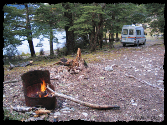 Am South Mavora Lake haben wir einen super idyllischen DoC Campingplatz gefunden. Eigentlich ist es nur eine Schotterstraße, die am See entlang führt. Am Anfang des Sees steht ein Toilettenhaus und die Fee-Box zum bezahlen der DoC-Gebühr. Man kann sich dann einfach eine einigermaßen gerade Stelle am See zum übernachten suchen. Ob es erlaubt ist Feuer zu machen wussten wir zwar nicht, aber in der Tonne war schon Asche und wir haben das Feuer natürlich auch wieder ordentlich gelöscht. |