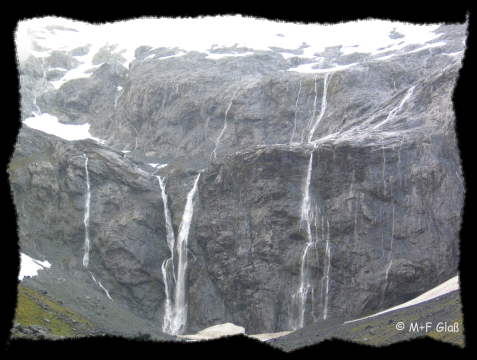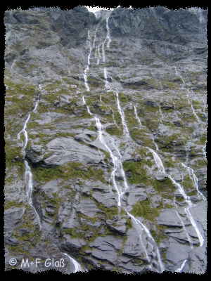 Auf dem Weg zum Milford Sound konnten wir aber wenigstens viele Wasserfälle sehen. Es sieht irre aus, wenn das Regenwasser in tausenden von feinen Wasserfällen an den steilen Felswänden herunter läuft. |