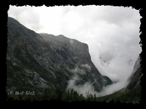 Die Wolken krochen auch im Milford Sound tief durch´s Tal. Hier scheint der Regen unendlich zu sein... |