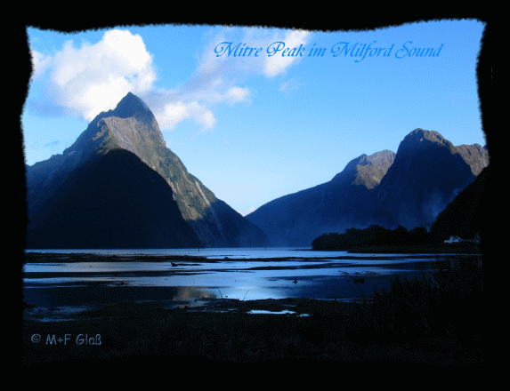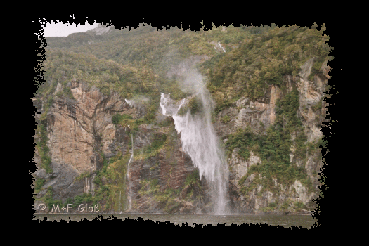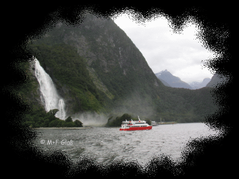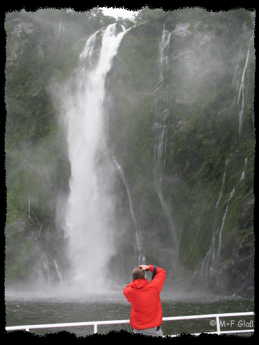 Über der Wasseroberfläche fasziniert der Milford Sound mit unzähligen Wasserfällen. Über die Sonne hatten wir uns morgens zu früh gefreut. Bei der Bootstour hat uns der Sound seinen typischen Regen präsentiert. Schön war´s trotzdem! |