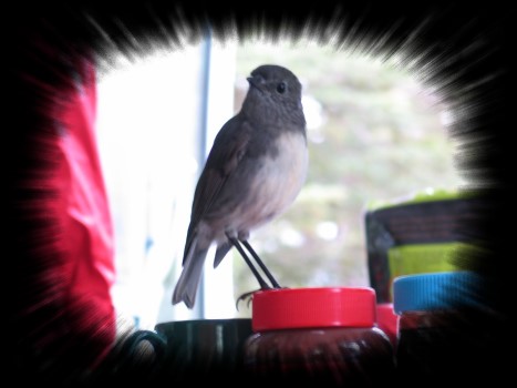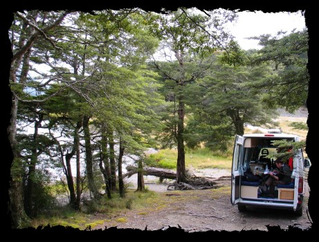 Zunächst dachten wir, dass wir wie im letzten Jahr ganz alleine hier am Mavora Lake wären, aber dann leistete uns ein Robin (Langbeinschnäpper) Gesellschaft beim Frühstück. Er kam ins WoMo, wunderte sich über unsere Nahrung und frühstückte dann ein paar der lästigen Sandflies im Camper. |