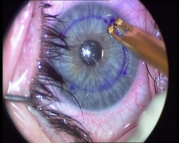 Rechts ist der bogenförmige Schnitt zu sehen. Durch diese OP haben sich meine Werte von vorher -4,25 und -6,00 auf -2,25 und -3,25 ungefähr halbiert.