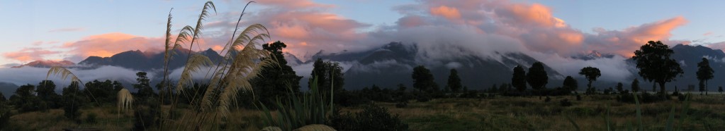 Sunset am Fox Gletscher (nahe des Lake Matheson)