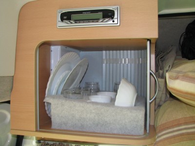 Das Geschirr steckte in einem Schrank im Alkoven. Darüber war der DVD-Player. |