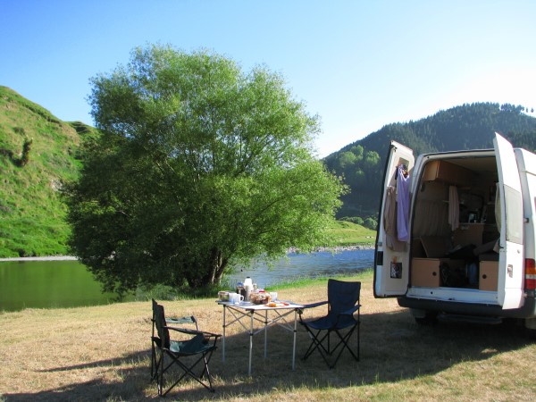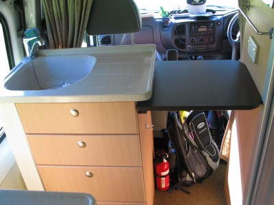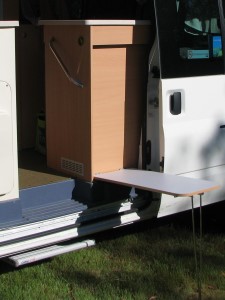 Bei geöffneter Seitentür konnte man ein kleines Tischchen und / oder eine Stufe ausklappen. Den kleinen Klapptisch haben wir aber nie wirklich benutzt, denn bei Bedarf haben wir lieber die extra gemieteten Campingstühle + Tisch benutzt. |