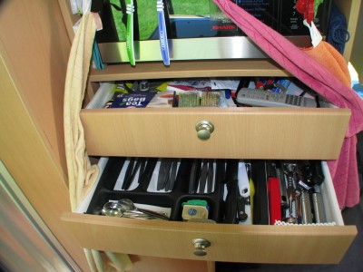 Die Schubladen für Besteck und Krimskrams befanden sich unter der Mikrowelle, die natürlich auch in diesem Campervan nur mit 230 Volt Stromanschluss auf dem Campingplatz funktionierte. |
