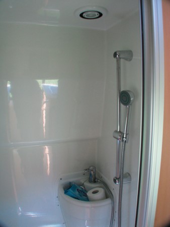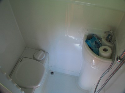 Das “Badezimmer” war wie gewohnt sehr eng. Die Toilette hatte eine manuelle Spülung. Die Dusche funktionierte sehr gut. Das heiße Wasser wurde nicht mit Gas, sondern per Wärmetauscher bei der Fahrt erzeugt und in einem isolierten Tank gespeichert. Wir konnten auch nach kühlen Nächten morgens warm duschen und Geschirr spülen. Bei externem Stromanschluss haben die 230 Volt für heißes Wasser gesorgt. |