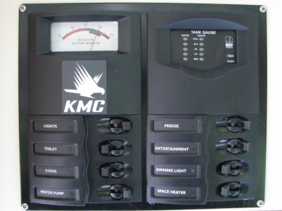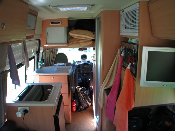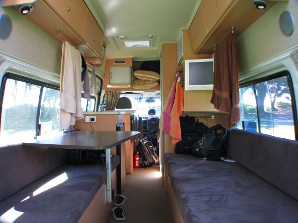 Bei diesem neuen Modell gab es zusätzlich einen (Flachbild-) Fernseher, den man oben im Bild rechts sieht, mit einem DVD-Player und Solarzellen auf dem Dach, die die zusätzliche Batterie für den Wohnbereich aufluden. Diese Batterie wird normalerweise nur während der Fahrt geladen, bzw. durch den Stromanschluss auf Campingplätzen und versorgt die Wohnraumbeleuchtung, Wasserpumpe, Kühlschrank und Lüftung der Gasheizung mit Strom. In diesem Modell wurden auch TV und DVD-Player über die 12 Volt Batterie betrieben. |