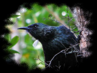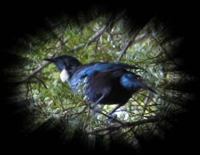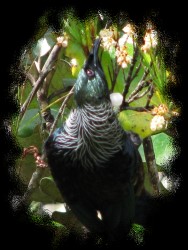 Die ca. 30 cm großen Tuis sind fast überall in Neuseeland zu finden, außer in den flachen Ebenen im Osten der Südinsel. Von weitem sehen sie einfach schwarz aus, im Sonnenlicht schimmert ihr Gefieder jedoch wunderschön in Schattierungen von lila über grün, blau und Kupfer mit einem hübschen “Wattebausch” aus weißen Federn vorne am Hals. |