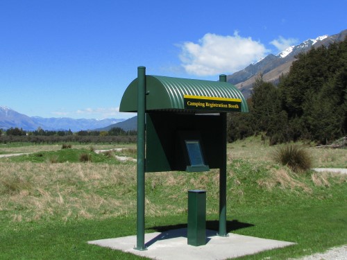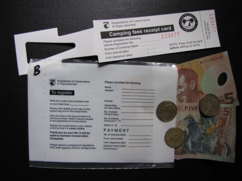 Bei der Ankunft auf einem DoC Camp entnimmt man einen Umschlag aus einer Klappe, füllt die Felder darauf aus, steckt das Geld hinein (die Gebühr steht am Brett, nicht auf dem Umschlag) und steckt ihn dann verschlossen in den Schlitz der eckigen Säule (Fee Box). Bei der unten dargestellten Variante gibt es noch einen Anhänger für´s Auto mit einer abreißbaren Nummer am Rand. Der Abschnitt kommt mit in den Umschlag, der Anhänger ist für´s Zelt, bzw. die Windschutzscheibe. |