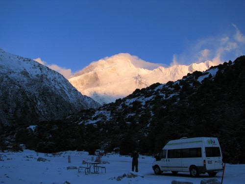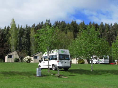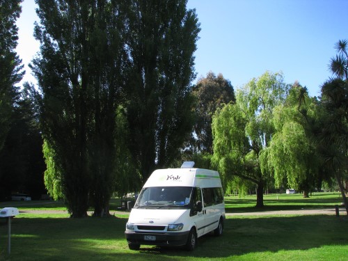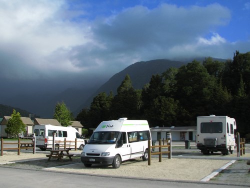 Dies ist ein Beispiel für einen Campingplatz mit asphaltierten Stellplätzen. Durch den guten Bodenbelag steht das Wohnmobil automatisch gerade, was angenehm ist zum schlafen, kochen, spülen, duschen, usw. Der Holiday Park am Fox Glacier war 2008 zwar noch relativ neu und sehr komfortabel, aber uns persönlich gefällt es mit mehr Natur direkt vor der “Haustür” besser. |