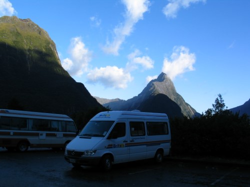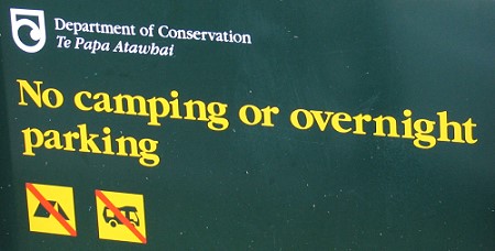 So wie hier am Milford Sound gibt es häufig Schilder mit der Aufschrift “No camping or overnight parking” und / oder auch einfache Piktogramme mit durchgestrichenen Zelten oder Wohnmobilen. Diese Schilder sollten unbedingt beachtet werden, denn sonst drohen unter Umständen saftige Geldstrafen. |